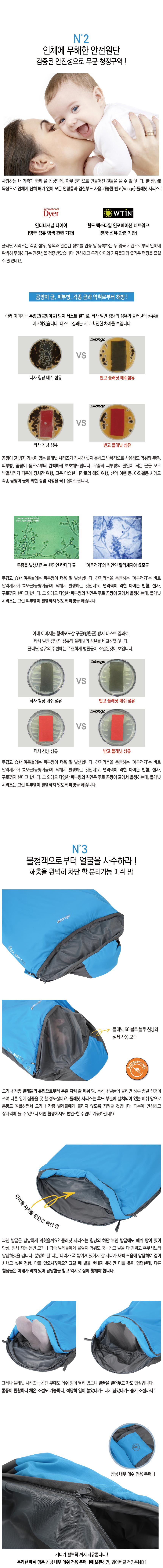 케이스 : 압축 소프트케이스 특징 : - 장거리 여행객, 트레킹 하는 분들에게 이상적인 침낭 - 곤충으로부터 안전하게 지켜주는 반고쉴드(HHL 기술처리) 모기퇴치 특수처리 원단 - 침낭 후드에 곤충,모기로부터 지켜주는 방충망 내장(탈부착 가능) - 방충망을 따로 보관할 수 있는 수납주머니 설치 - 극세 단열재 인슐라이트 - 안티 항균 처리로 먼지 진드기, 악취, 박테리아, 곰팡이 방지 - 바이탈프로텍션처리된 원단으로 벌레로부터 격퇴 - 양 옆의 멀티 코드로 3D후드를 열고 조일 수 있음 - 지퍼의 움직임을 용이하게하는 지퍼 끈처리 - 어둠속에도 찾기 쉽도록 지퍼에 반사 탭 처리 - 침낭 내부 2개의 포켓 주머니(방충망용, 소지품용) - 침낭을 보관/건조할때 편리한 하단부 고리 - 형태가 잡힌 다리 부분은 찬 공기가 머무는 공간을 최소화 하면서도 편안한 느낌 제공 - 뒤집어서 베개로도 사용 가능한 소프트 케이스 구성품 : 플래닛 50 볼트 블루 침낭(1개), 압축 소프트 케이스(1개)