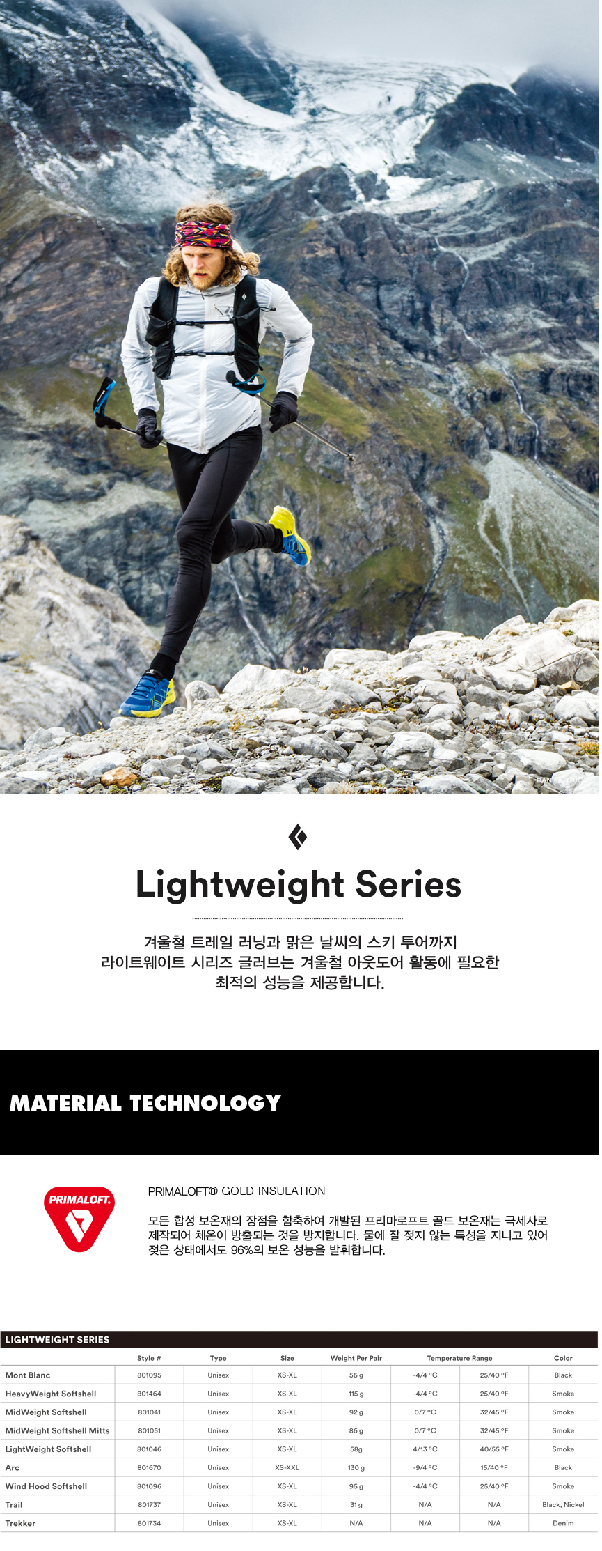 프리마로프트 골드 보온재가 내장되어 추운 알파인 환경에서 탁월한 보온성을 발휘하며 손바닥에 적용된 고무 그립 패턴은 트래킹 폴 및 등반 장비 사용 시 안정적인 그립력을 발휘합니다.
