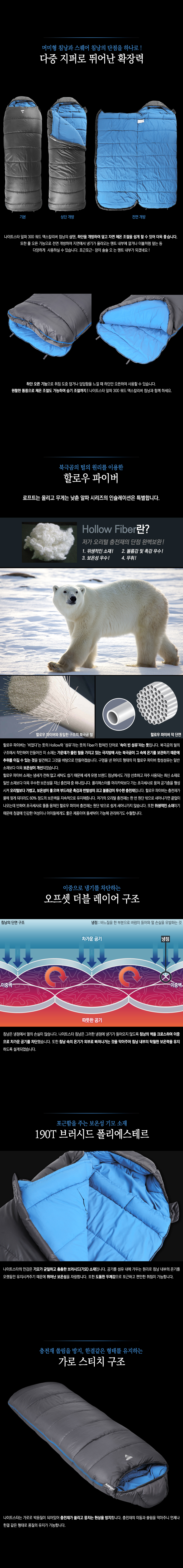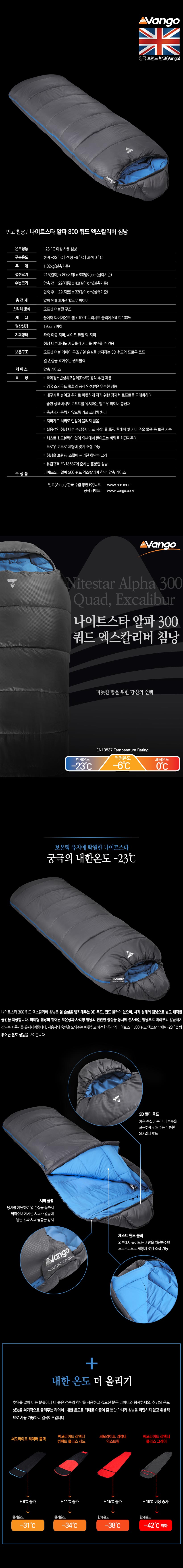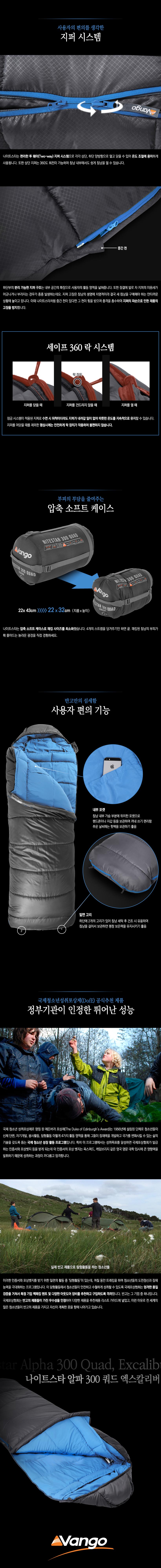 - 온도성능 : -23˚C 이상 사용 침낭 - 구분온도 : 한계-23˚C | 적정 -6˚C | 쾌적 0˚C - 무게 : 1.82kg(실측기준) - 펼친크기 : 215(길이) x 80(어깨) x 80(하단)cm(실측기준) - 수납크기 : 압축 전 - 22(지름) x 43(길이)cm(실측기준) 압축 후 - 22(지름) x 32(길이)cm(실측기준) - 충전재 : 알파 인슐레이션 할로우 파이버 - 스티치방식 : 오프셋 더블월 구조 - 재질 : 폴에어 다이아몬드 쉘 / 190T 브러시드 폴리에스테르 100% - 권장신장 : 195cm 이하 - 지퍼형태 : 좌측 이중 지퍼, 세이프 듀얼 락 지퍼 침낭 내부에서도 자유롭게 지퍼를 여닫을 수 있음 - 보온구조 : 오프셋 더블 레이어 구조 열 손실을 방지하는 3D 후드와 드로우 코드 열 손실을 막아주는 윈드블럭 - 케이스 : 압축 케이스 - 특징 : * 국제청소년성취포상제(DofE) 공식추천 제품 * 영국 스카우트 협회의 공식 인정받은 우수한 성능 * 내구성을 높이고 추가로 따뜻하게 하기 위한 잠재력 로프트를 극대화하며 습한 상태에서도 로프트를 유지하는 할로우 파이버 충전재 * 충전재가 뭉치지 않도록 가로 스티치 처리 * 지퍼가드 처리로 안감이 물리지 않음 * 실용적인 침낭 내부 수납주머니로 지갑, 휴대폰, 후레쉬 및 기타 주요 물품 등 보관 가능 * 체스트 윈드블럭이 있어 외부에서 들어오는 바람을 차단해주며 드로우 코드로 체형에 맞게 조절 가능 * 침낭을 보관/건조할 때 편리한 하단부 고리 * 유럽규격 EN13537에 준하는 훌륭한 성능 - 구성품 : 나이트스타 알파 300 쿼드 엑스칼리버 침낭, 압축 케이스