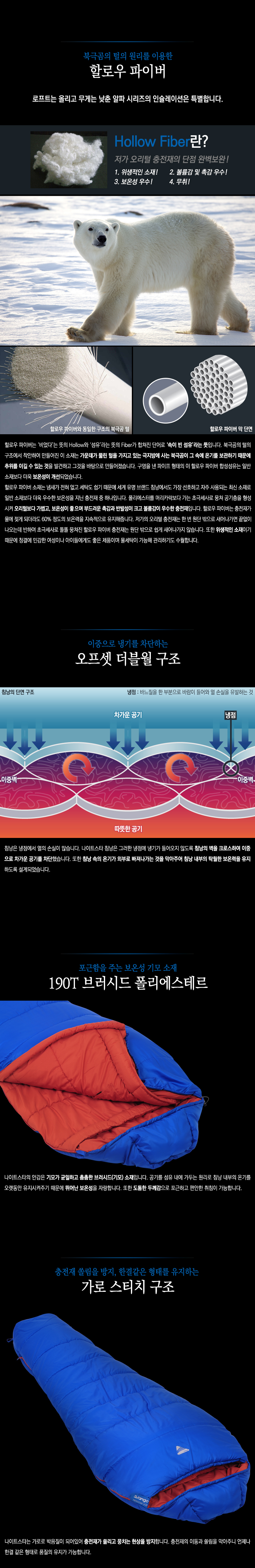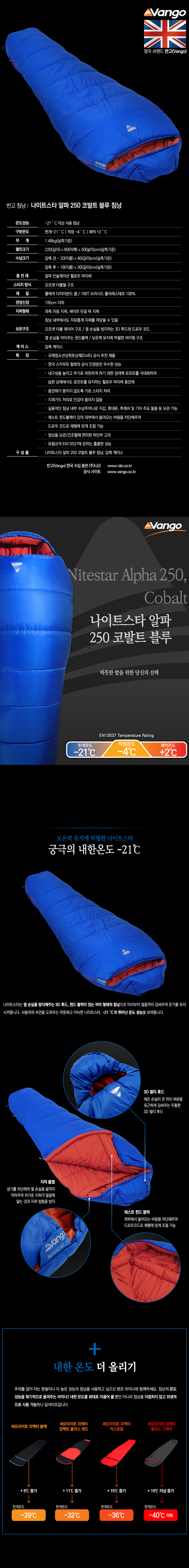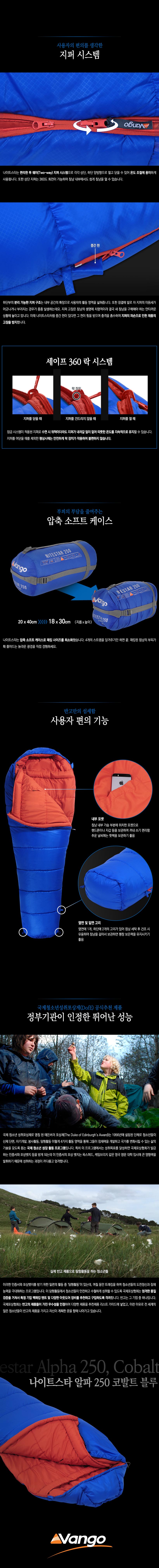 - 온도성능 : -21˚C 이상 사용 침낭 - 구분온도 : 한계-21˚C | 적정 -4˚C | 쾌적 +2˚C - 무게 : 1.48kg(실측기준) - 펼친크기 : 220(길이) x 80(어깨) x 50(넓이)cm(실측기준) - 수납크기 : 압축 전 - 20(지름) x 40(길이)cm(실측기준) 압축 후 - 18(지름) x 30(길이)cm(실측기준) - 충전재 : 알파 인슐레이션 할로우 파이버 - 스티치방식 : 오프셋 더블월 구조 - 재질 : 폴에어 다이아몬드 셀 / 190T 브러시드 폴리에스테르 100% - 권장신장 : 195cm 이하 - 지퍼형태 : 좌측 이중 지퍼, 세이프 듀얼 락 지퍼 침낭 내부에서도 자유롭게 지퍼를 여닫을 수 있음 - 보온구조 : 오프셋 더블 레이어 구조 열 손실을 방지하는 3D 후드와 드로우 코드 열 손실을 막아주는 윈드블럭 보온력 유지에 탁월한 머미형 구조 - 케이스 : 압축 케이스 - 특징 : * 국제청소년성취포상제(DofE) 공식추천 제품 * 영국 스카우트 협회의 공식 인정받은 우수한 성능 * 내구성을 높이고 추가로 따뜻하게 하기 위한 잠재력 로프트를 극대화하며 습한 상태에서도 로프트를 유지하는 할로우 파이버 충전재 * 충전재가 뭉치지 않도록 가로 스티치 처리 * 지퍼가드 처리로 안감이 물리지 않음 * 실용적인 침낭 내부 수납주머니로 지갑, 휴대폰, 후레쉬 및 기타 주요 물품 등 보관 가능 * 체스트 윈드블럭이 있어 외부에서 들어오는 바람을 차단해주며 드로우 코드로 체형에 맞게 조절 가능 * 침낭을 보관/건조할 때 편리한 하단부 고리 * 유럽규격 EN13537에 준하는 훌륭한 성능 - 구성품 : 나이트스타 알파 250 코발트 블루 침낭, 압축 케이스