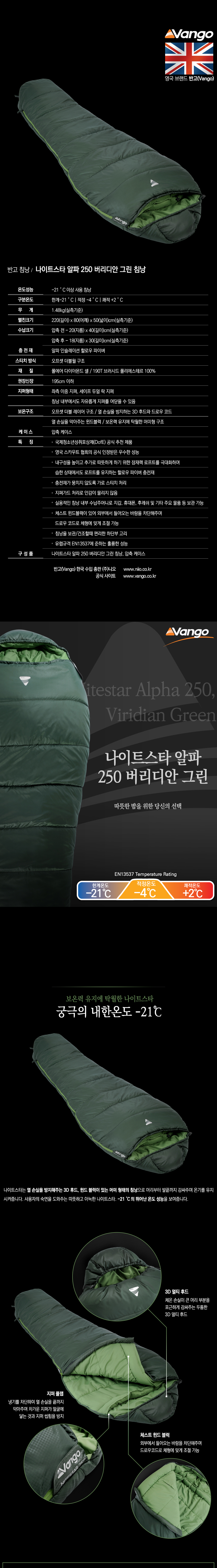 - 온도성능 : -21˚C 이상 사용 침낭 - 구분온도 : 한계-21˚C | 적정 -4˚C | 쾌적 +2˚C - 무게 : 1.48kg(실측기준) - 펼친크기 : 220(길이) x 80(어깨) x 50(넓이)cm(실측기준) - 수납크기 : 압축 전 - 20(지름) x 40(길이)cm(실측기준) 압축 후 - 18(지름) x 30(길이)cm(실측기준) - 충전재 : 알파 인슐레이션 할로우 파이버 - 스티치방식 : 오프셋 더블월 구조 - 재질 : 폴에어 다이아몬드 셀 / 190T 브러시드 폴리에스테르 100% - 권장신장 : 195cm 이하 - 지퍼형태 : 좌측 이중 지퍼, 세이프 듀얼 락 지퍼 침낭 내부에서도 자유롭게 지퍼를 여닫을 수 있음 - 보온구조 : 오프셋 더블 레이어 구조 열 손실을 방지하는 3D 후드와 드로우 코드 열 손실을 막아주는 윈드블럭 보온력 유지에 탁월한 머미형 구조 - 케이스 : 압축 케이스 - 특징 : * 국제청소년성취포상제(DofE) 공식추천 제품 * 영국 스카우트 협회의 공식 인정받은 우수한 성능 * 내구성을 높이고 추가로 따뜻하게 하기 위한 잠재력 로프트를 극대화하며 습한 상태에서도 로프트를 유지하는 할로우 파이버 충전재 * 충전재가 뭉치지 않도록 가로 스티치 처리 * 지퍼가드 처리로 안감이 물리지 않음 * 실용적인 침낭 내부 수납주머니로 지갑, 휴대폰, 후레쉬 및 기타 주요 물품 등 보관 가능 * 체스트 윈드블럭이 있어 외부에서 들어오는 바람을 차단해주며 드로우 코드로 체형에 맞게 조절 가능 * 침낭을 보관/건조할 때 편리한 하단부 고리 * 유럽규격 EN13537에 준하는 훌륭한 성능 - 구성품 : 나이트스타 알파 250 버리디안 그린 침낭, 압축 케이스