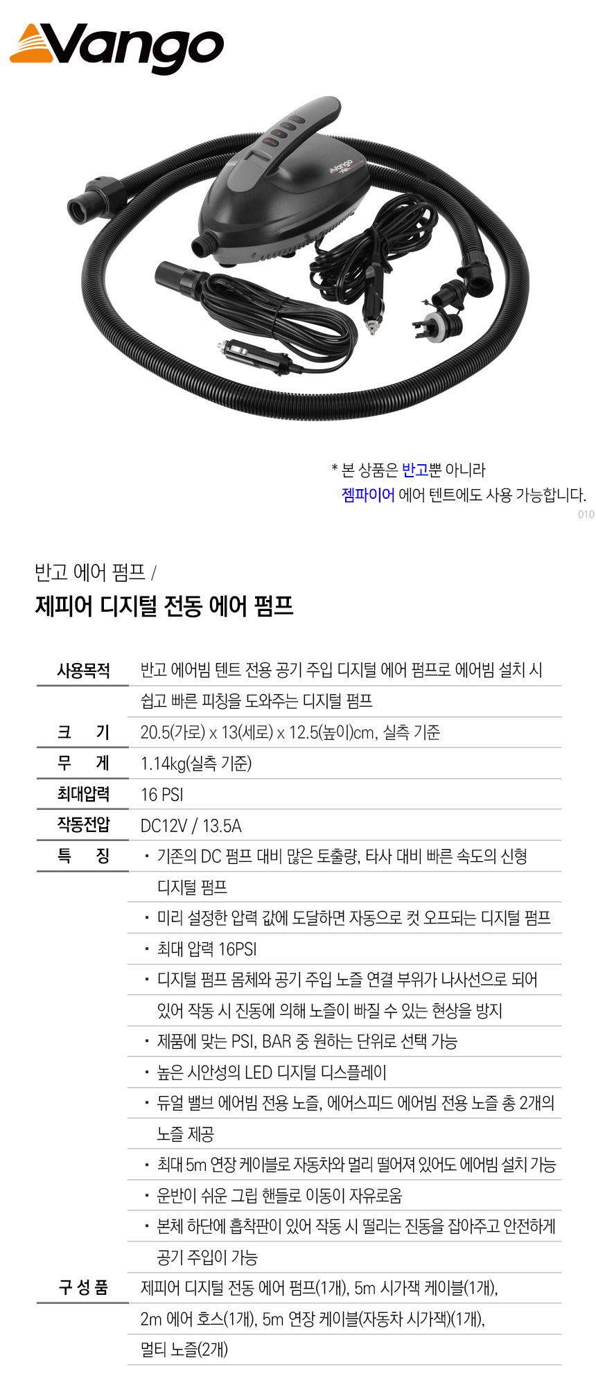 사용목적 : 반고 에어빔 텐트 전용 공기 주입 디지털 에어펌프로 에어빔 설치시 쉽고 빠른 피칭을 도와주는 디지털 펌프 크기 : 20.5(가로) x 13(세로) x 12.5(높이)cm, 실측 기준 무게 : 1.14kg(실측 기준) 최대압력 : 16 PSI 작동전압 : DC12V / 13.5A 특징 : - 기존의 DC 펌프 대비 많은 토출량, 타사 대비 빠른 속도의 신형 디지털 펌프 - 미리 설정한 압력 값에 도달하면 자동으로 컷 오프되는 디지털 펌프 - 최대 압력 16PSI - 디지털 펌프 몸체와 공기 주입 노즐 연결부위가 나사선으로 되어 있어 작동 시 진동에 의해 노즐이 빠질 수 있는 현상을 방지 - 제품에 맞는 PSI, BAR 중 원하는 단위로 선택가능 - 높은 시안성의 LED 디지털 디스플레이 - 듀얼 밸브 에어빔 전용 노즐, 에어스피드 에어빔 전용 노즐 총 2개의 노즐 제공 - 최대 5m 연장케이블로 자동차와 멀리 떨어져있어도 에어빔 설치 가능 - 운반이 쉬운 그립 핸들로 이동이 자유로움 - 본체 하단에 흡착판이 있어 작동 시 떨리는 진동을 잡아주고