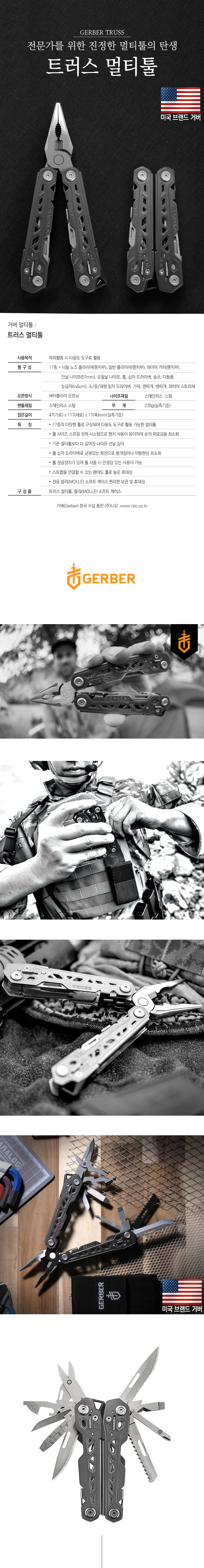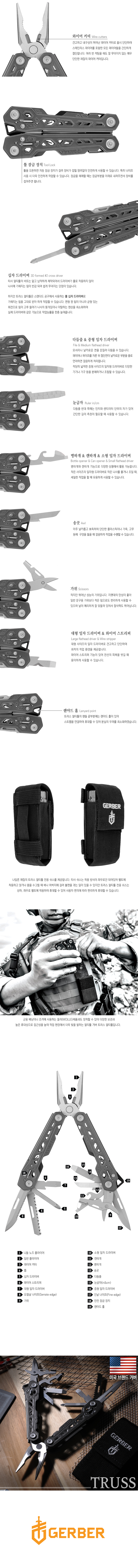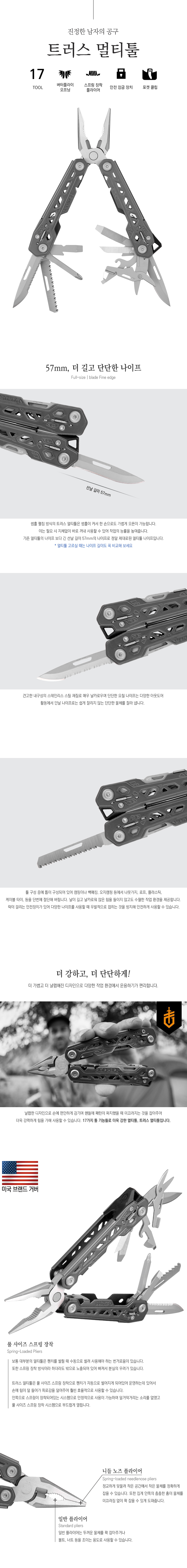 사용목적 : 야외활동 시 다용도 도구로 활용 툴구성 : 17종 = 니들 노즈 플라이어(펜치부), 일반 플라이어(펜치부), 와이어 커터(펜치부), 민날 나이프(57mm), 요철날 나이프, 톱, 십자 드라이버, 송곳, 다듬줄, 눈금자(in&cm), 소/중/대형 일자 드라이버, 가위, 캔따개, 병따개, 와이어 스트리퍼 오픈방식 : 버터플라이 오프닝 나이프재질 : 스테인리스 스틸 핸들재질 : 스테인리스 스틸 무게 : 228g(실측기준) 접은길이 : 47(가로) x 117(세로) x 17(폭)mm(실측기준) 특징 : - 17종의 다양한 툴로 구성되어 다용도 도구로 활용 가능한 멀티툴 - 풀 사이즈 스프링 장착 시스템 으로 펜치 사용이 용이하여 손의 피로감을 최소화 - 기존 멀티툴보다 더 길어진 나이프 선날 길이 - 풀 십자 드라이버로 균형있는 회전으로 뭉개짐이나 이탈현상 최소화 - 툴 잠금장치가 있어 툴 사용 시 안정감 있는 사용이 가능 - 스트랩을 연결할 수 있는 랜야드 홀로 높은 휴대성 - 전용 몰리(MOLLE) 소프트 케이스 편리한 보관 및 휴대성 구성품 : 트러스 멀티툴, 몰리(MOLLE) 소프트 케이스