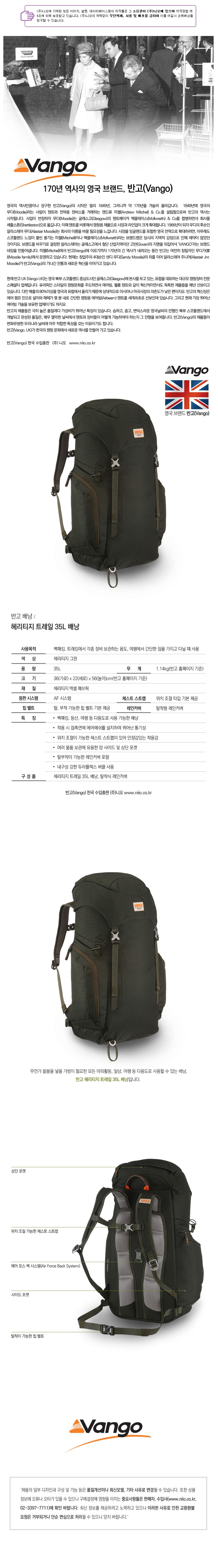 - 사용목적 : 백패킹, 트레킹에서 각종 장비를 보관하는 용도로 사용, 등산이나 여행에서 간단한 짐을 가지고 다닐 때 사용- 색상 : 헤리티지 그린- 용량 : 35L- 무게 : 1.14g(반고 홈페이지 기준)- 크기 : 36(가로) x 22(세로) x 56(높이)cm(반고 홈페이지 기준)- 재질 : 헤리티지 엑셀 패브릭- 등판시스템 : AF 시스템(Air Force System) - 체스트스트랩 : 위치 조절 타입 기본 제공- 힙 벨트 : 탈 부착 가능한 힙 벨트 기본 제공- 레인커버 : 탈착형 레인커버- 특징 : * 백패킹, 등산, 여행 등 다용도로 사용 가능한 배낭 * 착용 시 접촉면에 에어 메쉬를 설치하여 뛰어난 통기성 * 위치 조절이 가능한 체스트 스트랩이 있어 안정감있는 착용감 * 여러 물품 보관에 유용한 양 사이드 및 상단 포켓 * 탈부착이 가능한 레인커버 포함 * 내구성 강한 듀라플렉스 버클 사용- 구성품 : 헤리티지 트레일 35L 배낭, 탈착식 레인커버