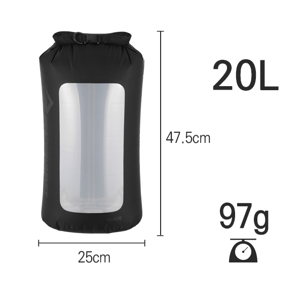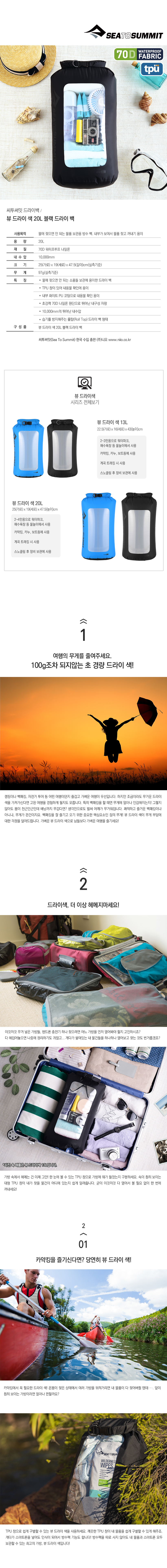 - 사용목적 : 물에 젖으면 안되는 물품 보관용 방수 백, 내부가 보여서 물품 찾고 꺼내기 용이 - 용량 : 20L - 재질 : 70D 워터프루프 나일론 - 내수압 : 10,000mm - 크기 : 25(가로) x 19(세로) x 47.5(높이)cm(실측기준) - 무게 : 97g(실측기준) - 특징 : * 물에 젖으면 안 되는 소품들 보관에 용이한 드라이 백 * TPU 창이 있어 내용물 확인 용이 * 내부 화이트 PU 코팅으로 내용물 확인 용이 * 초강력 70D 나일론 원단으로 뛰어난 내구성 자랑 * 10,000mm의 뛰어난 내수압 * 습기를 방지해주는 롤탑(Roll Top) 드라이 백 형태 - 구성품 : 뷰 드라이 색 20L 블랙 드라이백