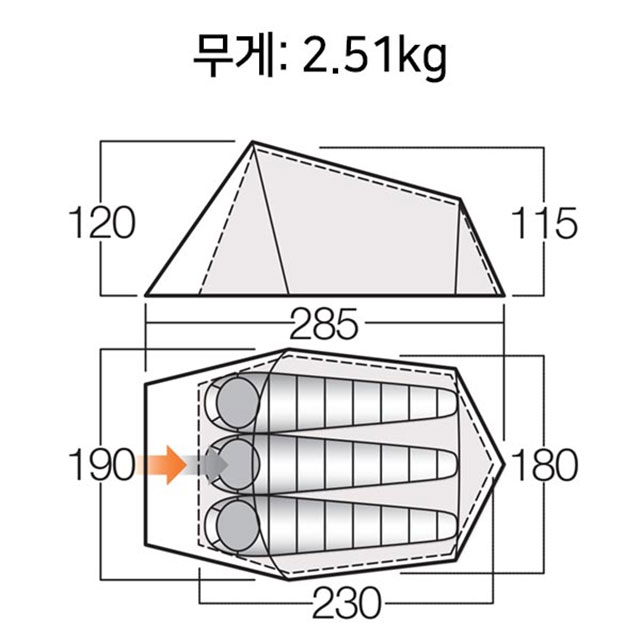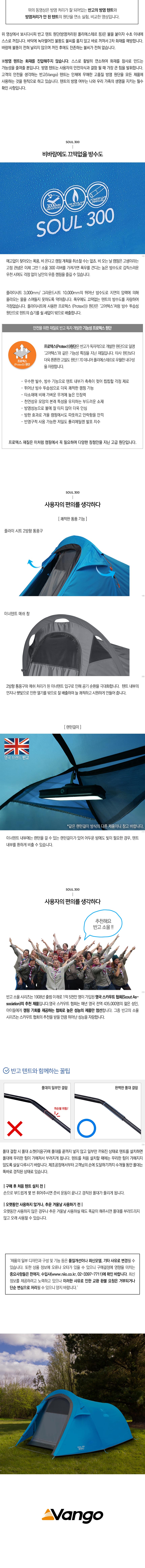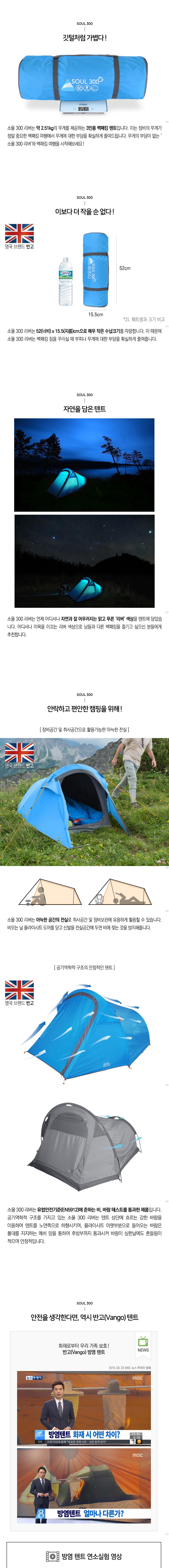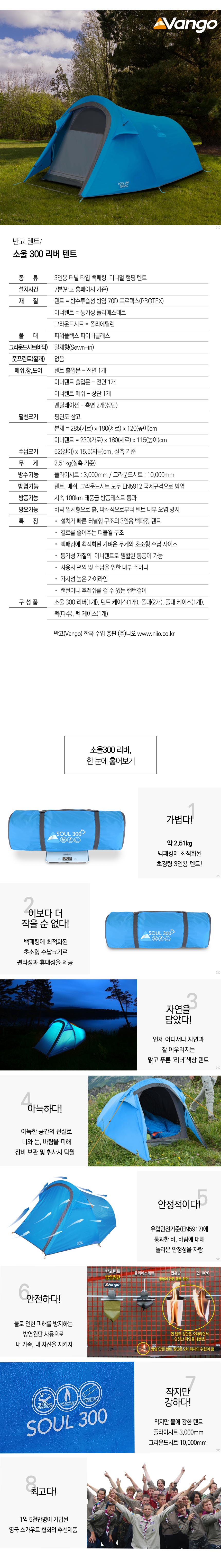 사용목적: 3인용 터널 타입 백패킹, 미니멀 캠핑 텐트 설치시간: 7분(반고 홈페이지 기준) 재질: 텐트 = 방수투습성 방염 70D 프로텍스(PROTEX) 이너텐트 = 통기성 폴리에스테르 그라운드시트 = 폴리에틸렌 폴대: 파워플렉스 파이버 글래스 그라운드시트(바닥): 일체형(Sewn-in) 풋프린트(깔개): 없음 메쉬,창,도어: 텐트 출입문 - 전면 1개 이너텐트 출입문 - 전면 1개 이너텐트 메쉬 - 상단 1개 벤틸레이션 - 측면 2개(상단) 펼친크기: 평면도 참고 본체 = 285(가로) x 190(세로) x 120(높이)cm 이너텐트 = 230(가로) x 180(세로) x 115(높이)cm 수납크기: 52(길이) x 15.5(지름)cm, 실측 기준 무게: 2.51kg(실측 기준) 방수기능: 플라이시트 : 3,000mm / 그라운드시트 : 10,000mm 방염기능: 텐트, 메쉬, 그라운드시트 모두 EN5912 국제규격으로 방염 방풍기능: 시속 100km 태풍급 방풍테스트 통과 방오기능: 바닥 일체형으로 흙, 파쇄석으로부터 텐트 내부 오염 방지 특징: - 설치가 빠른 터널형 구조의 3인용 백패킹 텐트 - 결로를 줄여주는 더블월 구조 - 백패킹에 최적화된 가벼운 무게와 초소형 수납 사이즈 - 통기성 재질의 이너텐트로 원활한 통풍이 가능 - 사용자 편의 및 수납을 위한 내부 주머니 - 가시성 높은 가이라인 - 랜턴이나 후레쉬를 걸 수 있는 랜턴걸이 구성품: 소울 300 리버(1개), 텐트 케이스(1개), 폴대(2개), 폴대 케이스(1개), 펙(다수), 펙 케이스(1개)