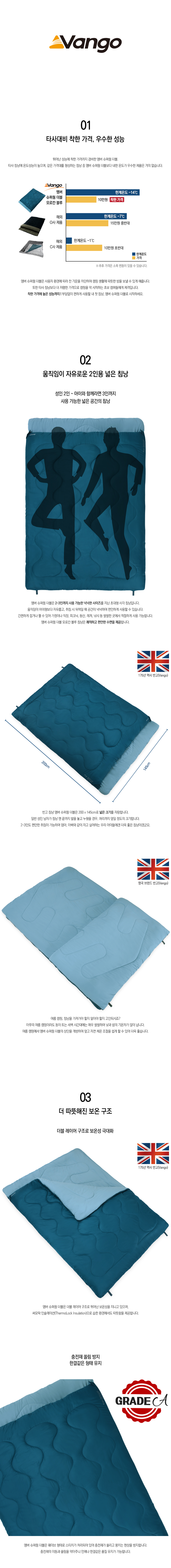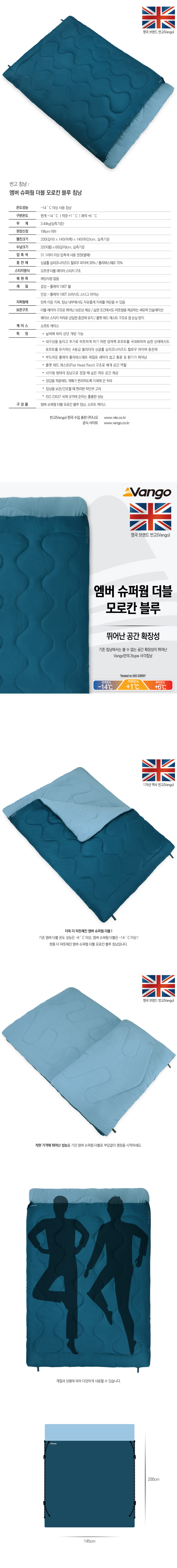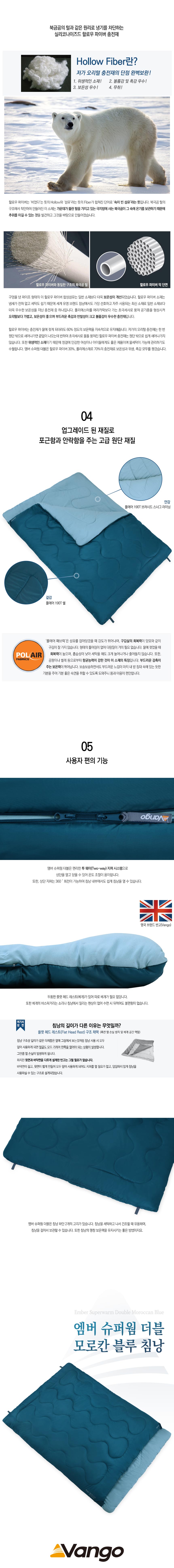 온도성능 : -14℃ 이상 사용 침낭 구분온도 : 한계-14℃ | 적정 +1℃ | 쾌적 +6℃ 무게 : 3.44kg(실측기준) 권장신장 : 195cm 이하 펼친크기 : 200(길이) x 145(어깨) x 145(하단)cm, 실측기준 수납크기 : 32(지름) x 60(길이)cm, 실측기준 압축색 : 31.1리터 이상 압축색 사용 권장(별매) 충전재 : 싱글홀 실리코나이즈드 할로우 파이버 30% 폴리에스테르 70% 스티치방식 : 오프셋 더블 레이어 스티치 구조 복원력 : 해당사항 없음 재질 : 겉감 - 폴에어 190T 쉘 안감 - 폴에어 190T 브러시드 스너그 라이닝 지퍼형태 : 양측 이중 지퍼 침낭 내부에서도 자유롭게 지퍼를 여닫을 수 있음 보온구조 : 더블 레이어 구조로 뛰어난 보온성 제공 습한 조건에서도 따뜻함을 제공하는 써모락 인슐레이션 웨이브 스티치 처리로 균일한 충전재 유지 플랫 헤드 레스트 구조로 열 손실 방지 케이스 : 소프트 케이스 특징 : - 날씨에 따라 상단 개방 가능 - 내구성을 높이고 추가로 따뜻하게 하기 위한 잠재력 로프트를 극대화하며 습한 상태에서도 로프트를 유지하는 A등급 퀄리티의 싱글홀 실리코나이즈드 할로우 파이버 충전재 - 부드러운 폴에어 폴리에스테르 재질로 세탁이 쉽고 통풍 및 환기가 뛰어남 - 플랫 헤드 레스트(Flat Head Rest) 구조로 베개 공간 역할 - 사각형 형태의 침낭으로 잠잘 때 넓은 여유 공간 제공 - 장갑을 착용해도 개폐가 편리하도록 지퍼에 끈 처리 - 침낭을 보관/건조할 때 편리한 하단부 고리 - ISO 23537 국제 규격에 준하는 훌륭한 성능 구성품 : 엠버 슈퍼웜 더블 모로칸 블루 침낭, 소프트 케이스