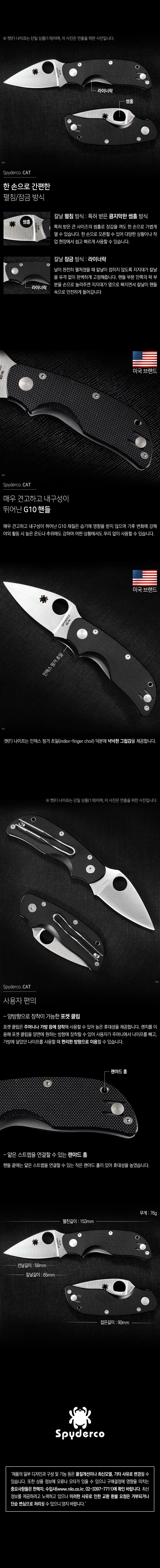 종류: 접이식(폴딩) 나이프 용도: 일상 라이프, EDC용, 캠핑용, 등산용, 아웃도어 나이프 칼날종류: 민날(Fine edge) 칼날재질: CTS BD1N [나이프 재질 상세표 보기] 클릭! 핸들재질: G10 [핸들 재질 상세표 보기] 클릭! 칼날두께: 3mm(실측기준) 펄친길이: 153mm(실측기준) 접은길이: 90mm(실측기준) 칼날길이: 65mm(실측기준) 선날길이: 58mm(실측기준) 칼날펼침방식: 썸홀 방식 칼날잠금방식: 라이너락 무게: 76g(실측기준) 특징: - EDC(Every Day Carry) 제품으로 휴대가 간편한 포켓용 나이프 - 특허받은 큰 사이즈의 썸홀로 장갑을 껴도 한 손으로 가볍게 오픈 가능 - 손가락 모양에 맞춘 인체공학적인 핸들 디자인 - 포켓 클립이 내장되어 있어 가방이나 주머니에 장착 가능 - 얇은 스트랩을 연결할 수 있는 랜야드 홀 구성품: 캣(F) 나이프 소지허가: 필요없음