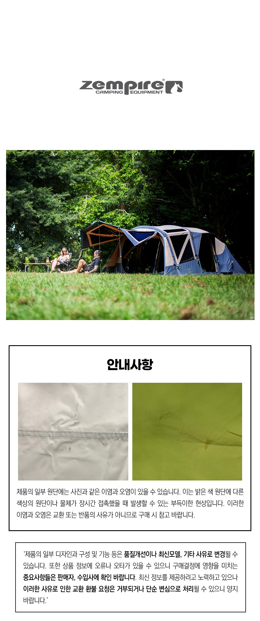종류 : 5인용 에어빔 터널 타입 대형 캠핑 텐트 재질 : 텐트 = TC 폴리 코튼(200g/㎡) 35% 코튼 / 65% 폴리에스테르 이너텐트 = TC 폴리 코튼 그라운드시트 = 210D 폴리 옥스포드 폴대 : 직경 13cm 듀얼밸브 슈퍼 에어빔, 7001 알루미늄 폴대 에어빔 공기압 : 4계절 주입 압력 7psi 또는 48kPa 그라운드 시트(바닥) : 일체형 바닥(분리 안됨) 풋 프린트(깔개) : 별매