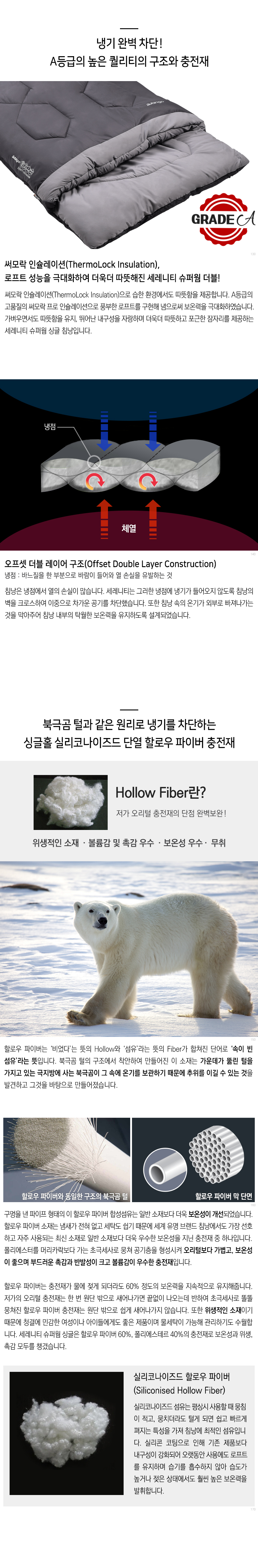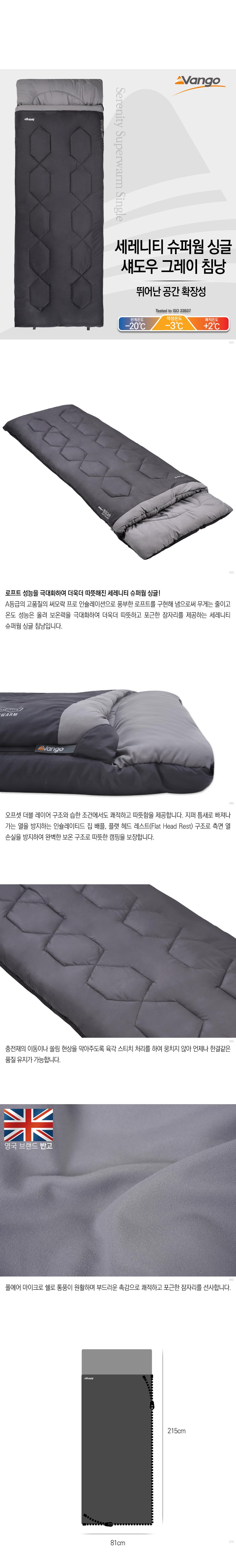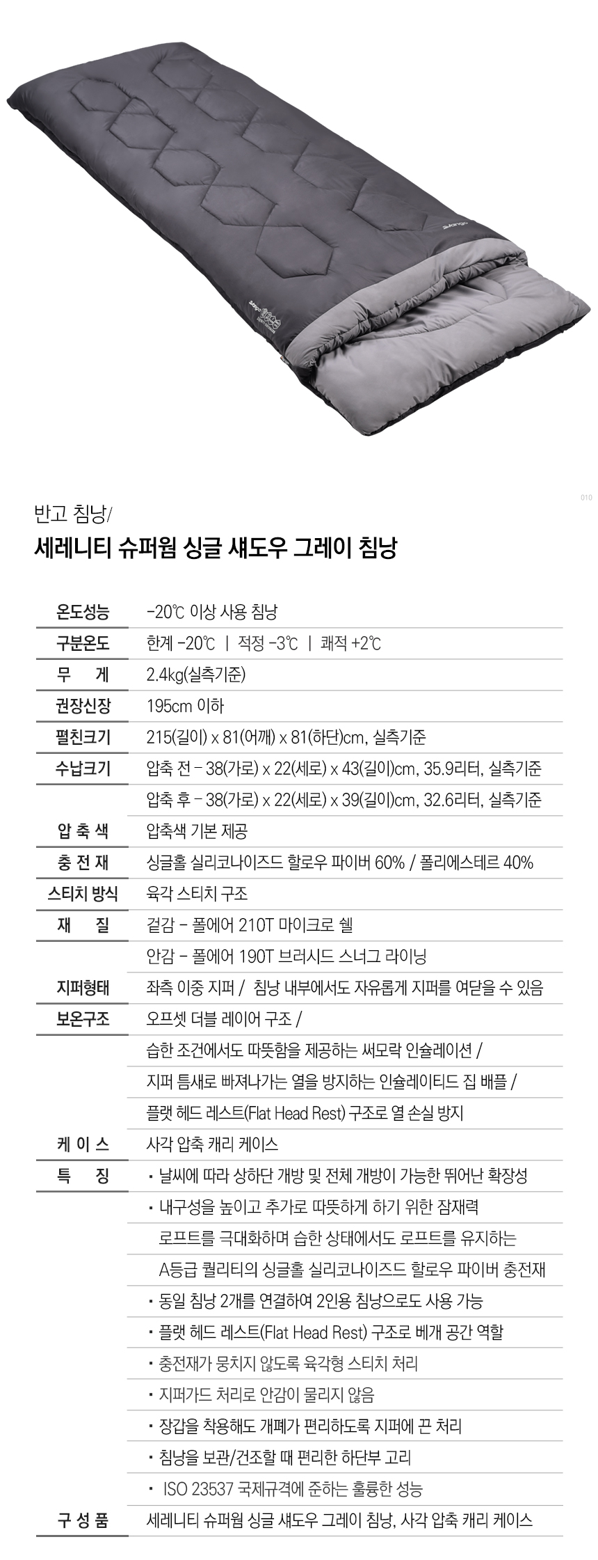 온도성능: -20℃ 이상 사용 침낭 구분온도: 한계 -20℃ ㅣ 적정 -3℃ ㅣ 쾌적 +2℃ 무게: 2.4kg(실측기준) 권장신장: 195cm 이하 펼친크기: 215(길이) x 81(어깨) x 81(하단)cm, 실측기준 수납크기: 압축 전 – 38(가로) x 22(세로) x 43(길이)cm, 35.9리터, 실측기준 압축 후 – 38(가로) x 22(세로) x 39(길이)cm, 32.6리터, 실측기준 압축색: 압축색 기본 제공 충전재: 싱글홀 실리코나이즈드 할로우 파이버 60% / 폴리에스테르 40% 스티치 방식: 육각 스티치 구조 재질: 겉감 - 폴에어 210T 마이크로 쉘 / 안감 - 폴에어 190T 브러시드 스너그 라이닝 지퍼형태: 좌측 이중 지퍼 / 침낭 내부에서도 자유롭게 지퍼를 여닫을 수 있음 보온구조: 오프셋 더블 레이어 구조 / 습한 조건에서도 따뜻함을 제공하는 써모락 인슐레이션 / 지퍼 틈새로 빠져나가는 열을 방지하는 인슐레이티드 집 배플 / 플랫 헤드 레스트(Flat Head Rest) 구조로 열 손실 방지 케이스: 사각 압축 캐리 케이스 특징: - 날씨에 따라 상하단 개방 및 전체 개방이 가능한 뛰어난 확장성 - 내구성을 높이고 추가로 따뜻하게 하기 위한 잠재력 로프트를 극대화하며 습한 상태에서도 로프트를 유지하는 A등급 퀄리티의 싱글홀 실리코나이즈드 할로우 파이버 충전재 - 동일 침낭 2개를 연결하여 2인용 침낭으로도 사용 가능 - 플랫 헤드 레스트(Flat Head Rest) 구조로 베개 공간 역할 - 충전재가 뭉치지 않도록 육각형 스티치 처리 - 지퍼가드 처리로 안감이 물리지 않음 - 장갑을 착용해도 개폐가 편리하도록 지퍼에 끈 처리 - 침낭을 보관/건조할 때 편리한 하단부 고리 - ISO 23537 국제규격에 준하는 훌륭한 성능 구성품: 세레니티 슈퍼웜 싱글 섀도우 그레이 침낭, 사각 압축 캐리 케이스