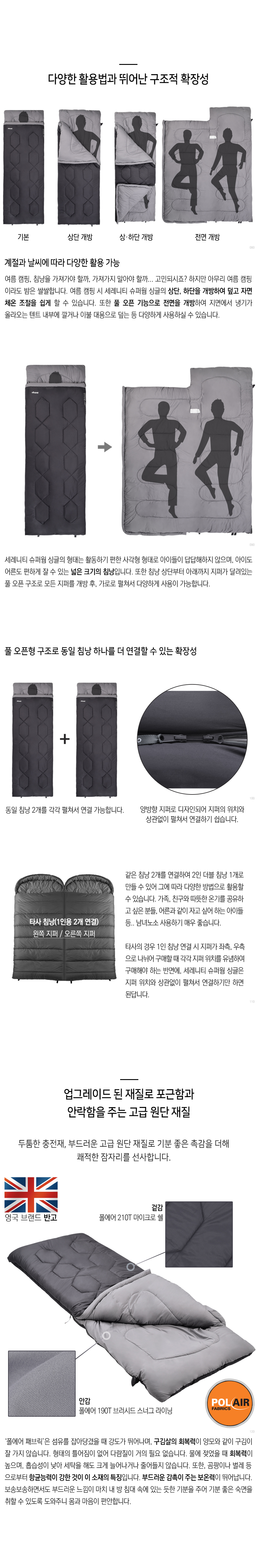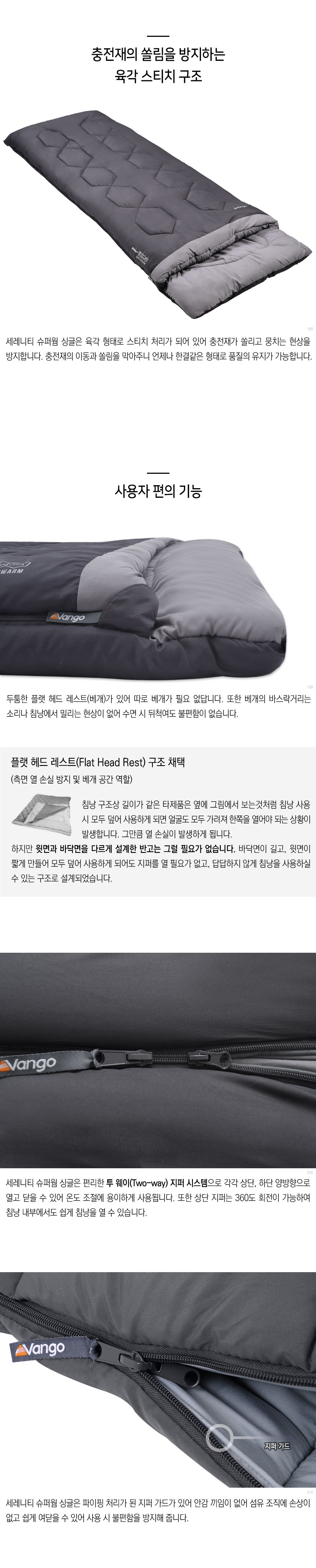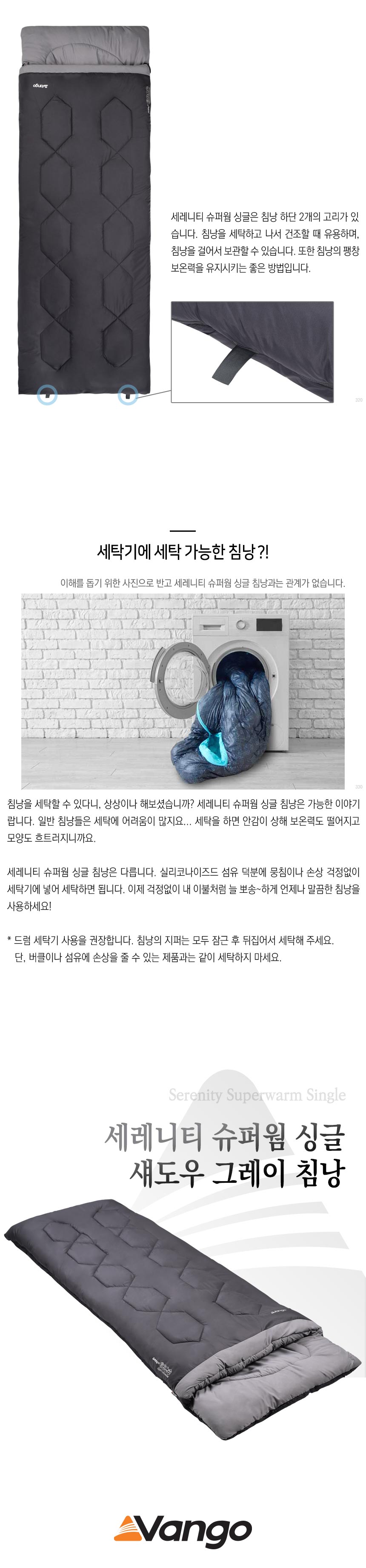 온도성능: -20℃ 이상 사용 침낭 구분온도: 한계 -20℃ ㅣ 적정 -3℃ ㅣ 쾌적 +2℃ 무게: 2.4kg(실측기준) 권장신장: 195cm 이하 펼친크기: 215(길이) x 81(어깨) x 81(하단)cm, 실측기준 수납크기: 압축 전 – 38(가로) x 22(세로) x 43(길이)cm, 35.9리터, 실측기준 압축 후 – 38(가로) x 22(세로) x 39(길이)cm, 32.6리터, 실측기준 압축색: 압축색 기본 제공 충전재: 싱글홀 실리코나이즈드 할로우 파이버 60% / 폴리에스테르 40% 스티치 방식: 육각 스티치 구조 재질: 겉감 - 폴에어 210T 마이크로 쉘 / 안감 - 폴에어 190T 브러시드 스너그 라이닝 지퍼형태: 좌측 이중 지퍼 / 침낭 내부에서도 자유롭게 지퍼를 여닫을 수 있음 보온구조: 오프셋 더블 레이어 구조 / 습한 조건에서도 따뜻함을 제공하는 써모락 인슐레이션 / 지퍼 틈새로 빠져나가는 열을 방지하는 인슐레이티드 집 배플 / 플랫 헤드 레스트(Flat Head Rest) 구조로 열 손실 방지 케이스: 사각 압축 캐리 케이스 특징: - 날씨에 따라 상하단 개방 및 전체 개방이 가능한 뛰어난 확장성 - 내구성을 높이고 추가로 따뜻하게 하기 위한 잠재력 로프트를 극대화하며 습한 상태에서도 로프트를 유지하는 A등급 퀄리티의 싱글홀 실리코나이즈드 할로우 파이버 충전재 - 동일 침낭 2개를 연결하여 2인용 침낭으로도 사용 가능 - 플랫 헤드 레스트(Flat Head Rest) 구조로 베개 공간 역할 - 충전재가 뭉치지 않도록 육각형 스티치 처리 - 지퍼가드 처리로 안감이 물리지 않음 - 장갑을 착용해도 개폐가 편리하도록 지퍼에 끈 처리 - 침낭을 보관/건조할 때 편리한 하단부 고리 - ISO 23537 국제규격에 준하는 훌륭한 성능 구성품: 세레니티 슈퍼웜 싱글 섀도우 그레이 침낭, 사각 압축 캐리 케이스