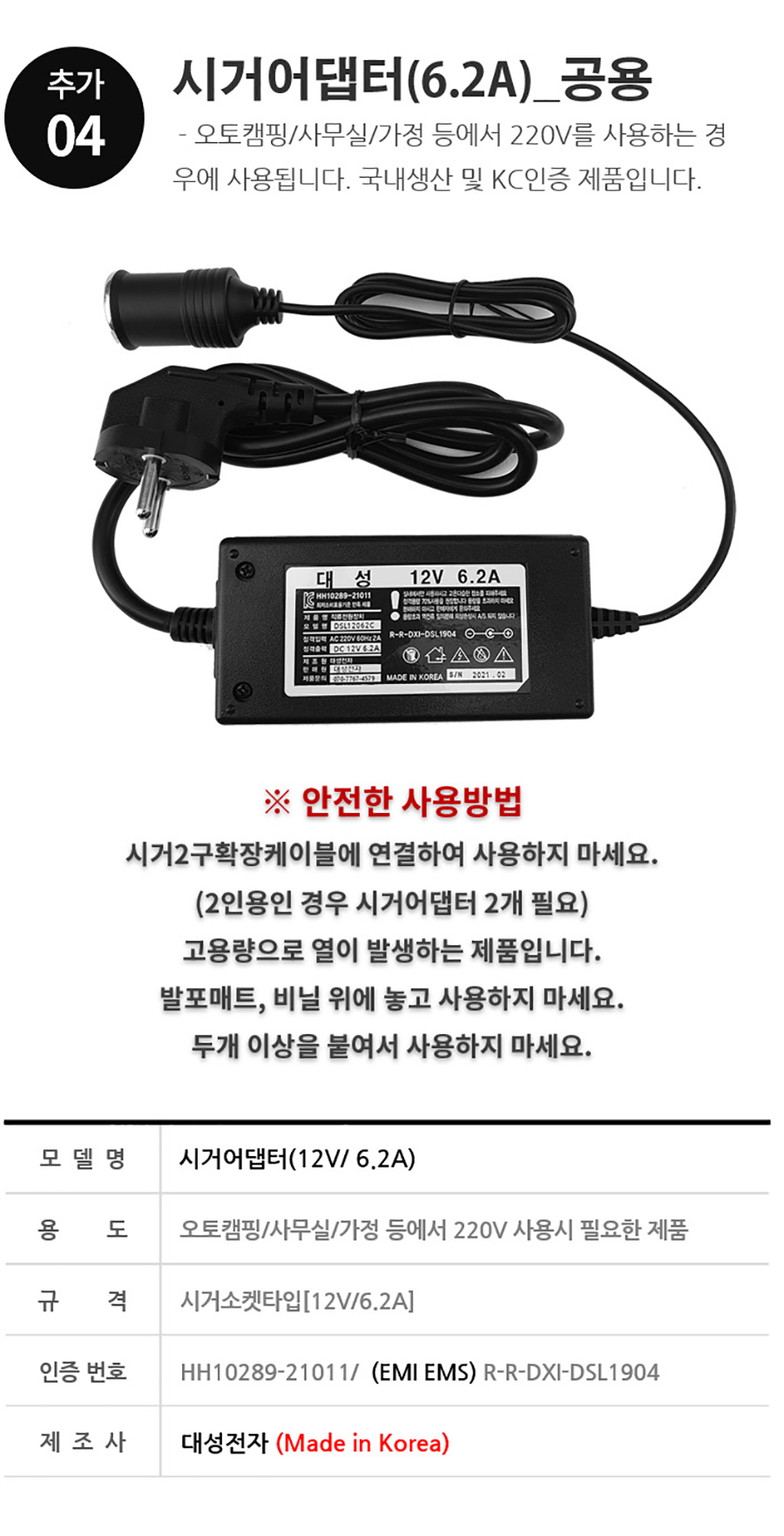 시거어댑터(12V/6.2A)/국산/온열매트_공용