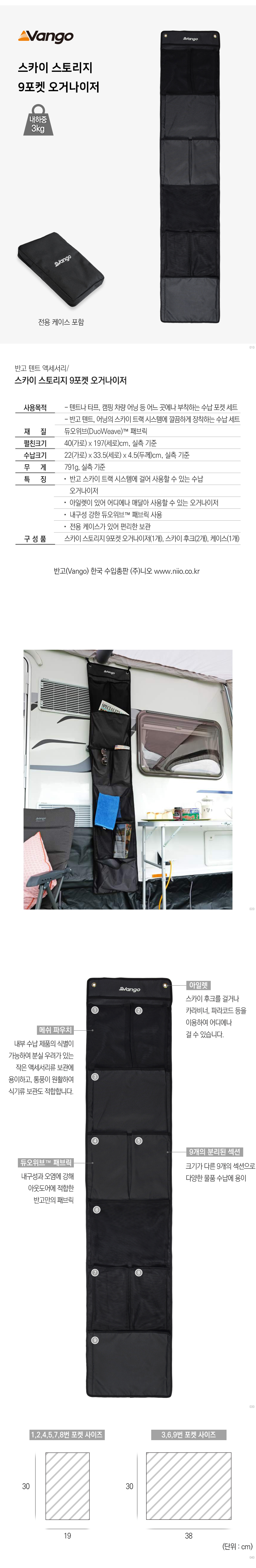 사용목적 : - 텐트나 타프, 캠핑 차량 어닝 등 어느 곳에나 부착하는 수납 포켓 세트 - 반고 텐트, 어닝의 스카이 트랙 시스템에 깔끔하게 장착하는 수납 세트 재질 : 듀오위브(DuoWeave)™ 패브릭 펼친크기 : 40(가로) x 197(세로)cm, 실측 기준 수납크기 : 22(가로) x 33.5(세로) x 4.5(두께)cm, 실측 기준 무게 : 791g, 실측 기준 특징 : - 반고 스카이 트랙 시스템에 걸어 사용하 수 있는 수납 오거나이저 - 아일렛이 있어 어디에나 매달아 사용할 수 있는 오거나이저 - 내구성 강한 듀오위브™ 패브릭 사용 - 전용 케이스가 있어 편리한 보관 구성품 : 스카이 스토리지 9포켓 오거나이저(1개), 스카이 후크(2개), 케이스(1개)