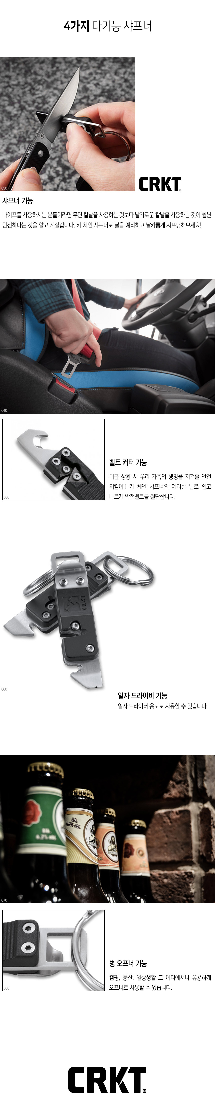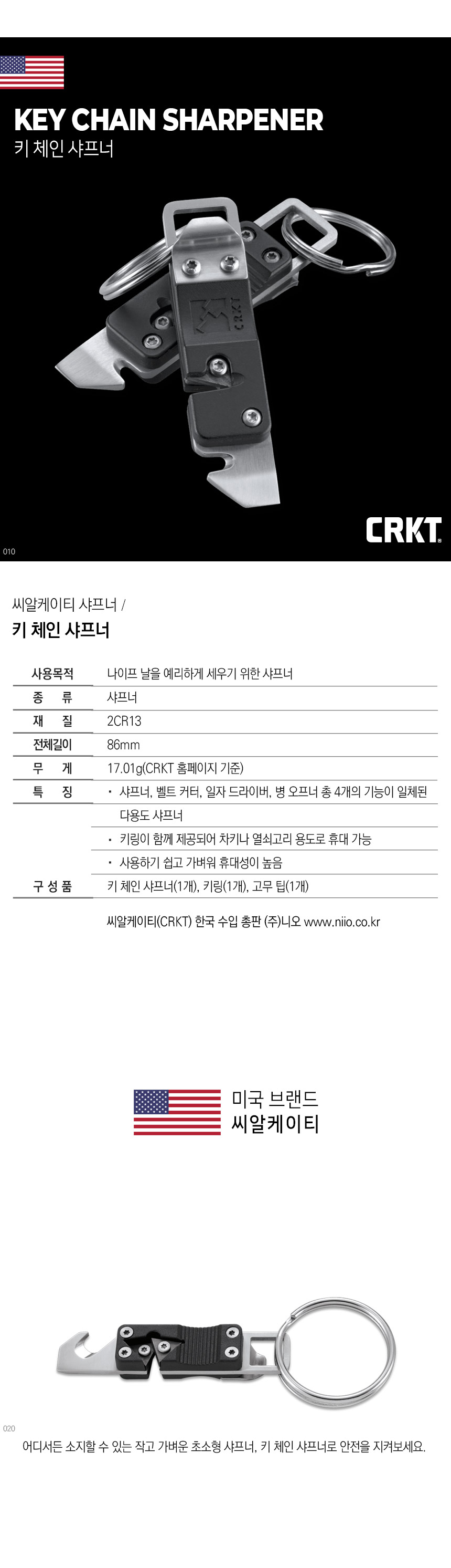 사용목적 : 나이프 날을 예리하게 세우기 위한 샤프너 종류 : 샤프너 재질 : 2CR13 전체길이 : 86mm 무게 : 17.01g(CRKT 홈페이지 기준) 특징 : - 샤프너, 벨트 커터, 일자 드라이버, 병 오프너 총 4개의 기능이 일체된 다용도 샤프너 - 키링이 함께 제공되어 차키나 열쇠고리 용도로 휴대 가능 - 사용하기 쉽고 가벼워 휴대성이 높음 구성품 : 키 체인 샤프너(1개), 키링(1개), 고무 팁(1개)