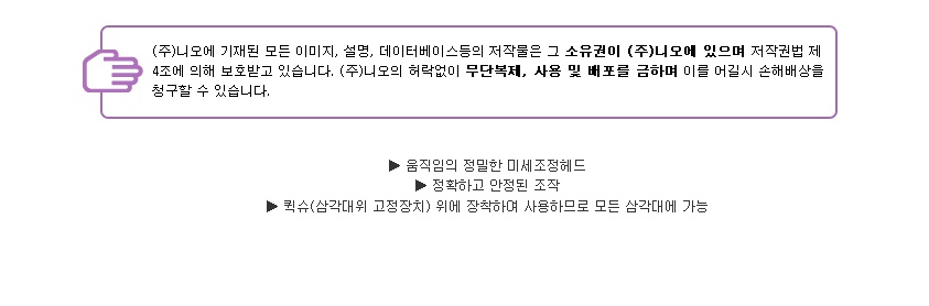 - 움직임이 정밀한 미세조정헤드 - 정확하고 안정된 조작 - 5.5mm 크기 퀵슈(삼각대위 고정장치) 위에 장착하여 사용 가능.